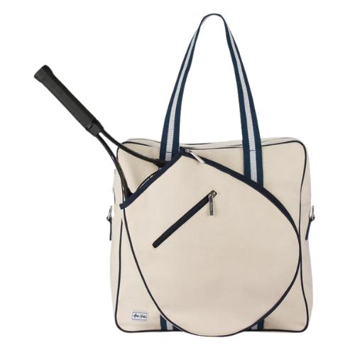 The Hamptons Tennis Tour Bag is accented with cotton webbing handles and a chic silhouette. The removable adjustable strap makes it easy to wear this bag as a crossbody. On the interior, there are two mesh pockets for water and tennis balls and an interior zip to keep valuables stored away during your match.