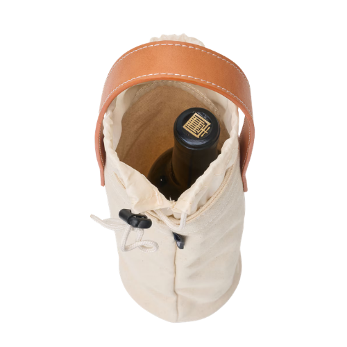 Our canvas single wine tote is designed to fit one bottle of wine. The drawstring closure ensures the bottle won't fall out, and the vegan leather strap makes for convenient carrying.